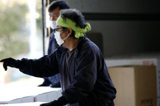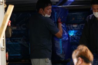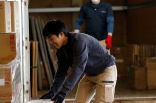 (仕分けした製品をトラックに積む)